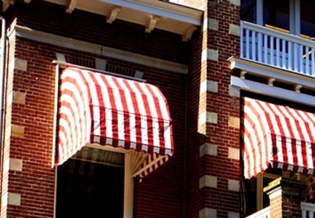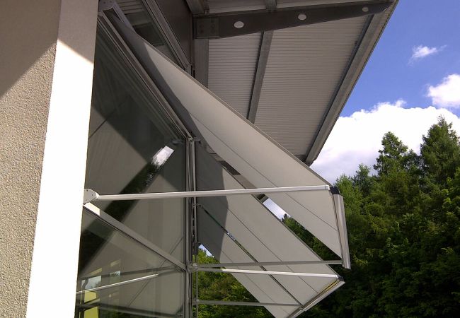 • Vertikal vor einem Fenster, einer Glasfassade oder seitlich bzw. vorne unter einem Terrassendach: Fenster- bzw. Senkrechtmarkise