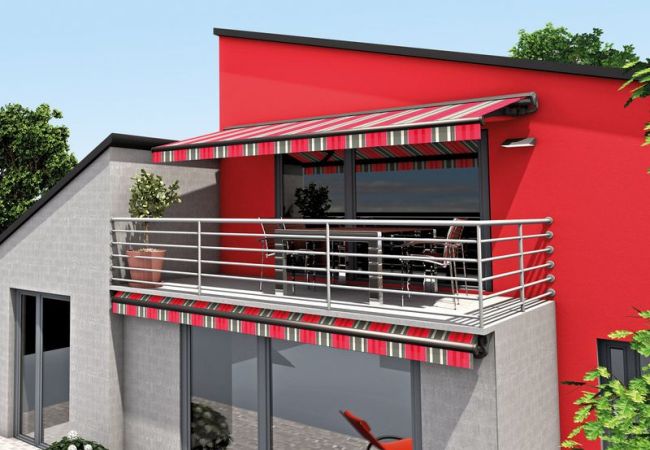 • Ist die Markise schon geschützt angebracht, z.B. unter einem Vordach, wäre technisch bedingt ein zusätzlicher Schutz durch ein Schutzdach oder eine Kassette nicht nötig: offene Gelenkarmmarkise